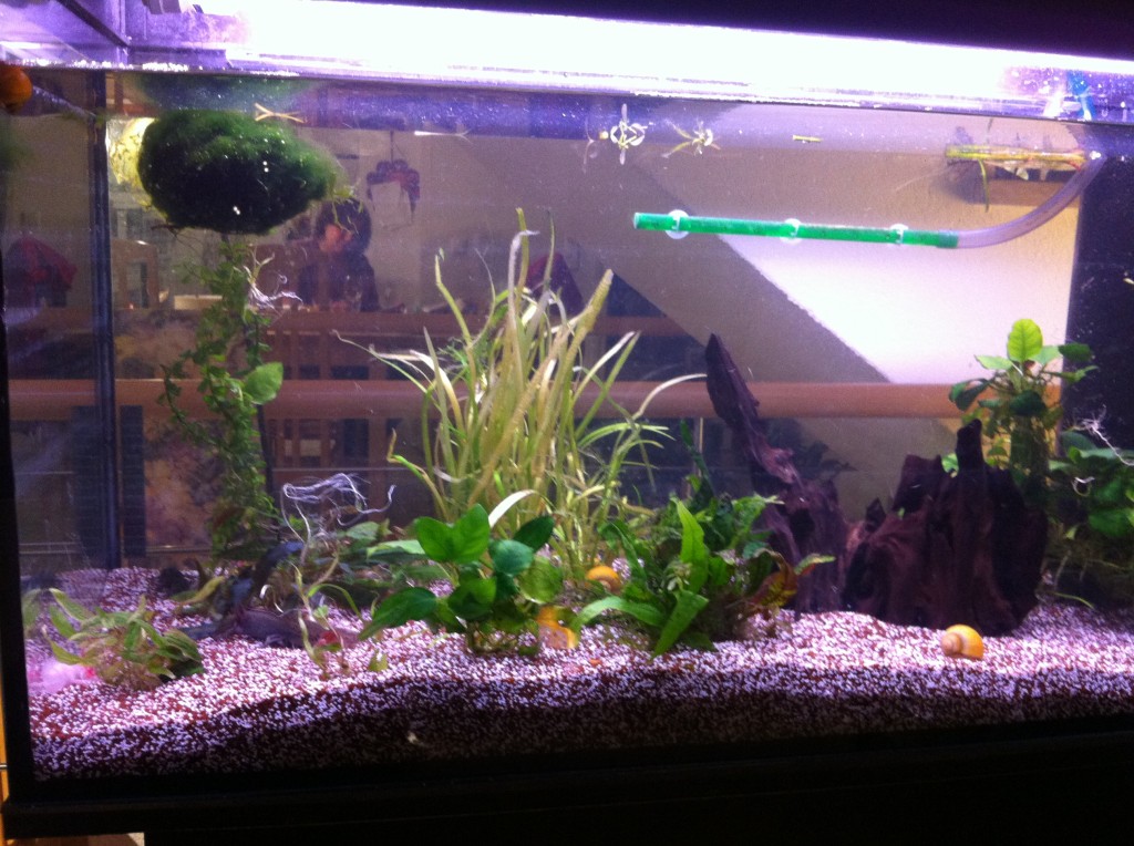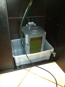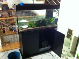 Am Abend die neuen Bewohner erstmal in einem kleinen Aquarium untergebracht, das große aufgestellt, Kies rein, Wasser dazu, die Pflanzen reingesteckt und dann die Technik – den Filter – angeschlossen. Dabei ist gleich mal was schief gegangen und ein paar Liter Wasser waren im Wohnzimmer unterwegs… 🙁