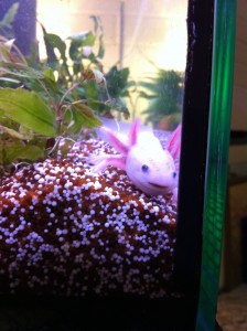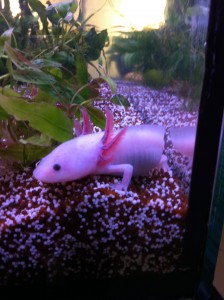Aber wie es dazu gekommen? In einer Fernsehserie haben unser Kinder in nur ein oder zwei kurzen Szenen das Haustier eines Mädchens gesehen: ein weisses “etwas” in einem Aquarium, mit schwarzen Kulleraugen und einem freundlichen Lächeln im Gesicht. Nur was war das? Nach der Suche im Internet haben wir es gefunden: ein Axolotl.