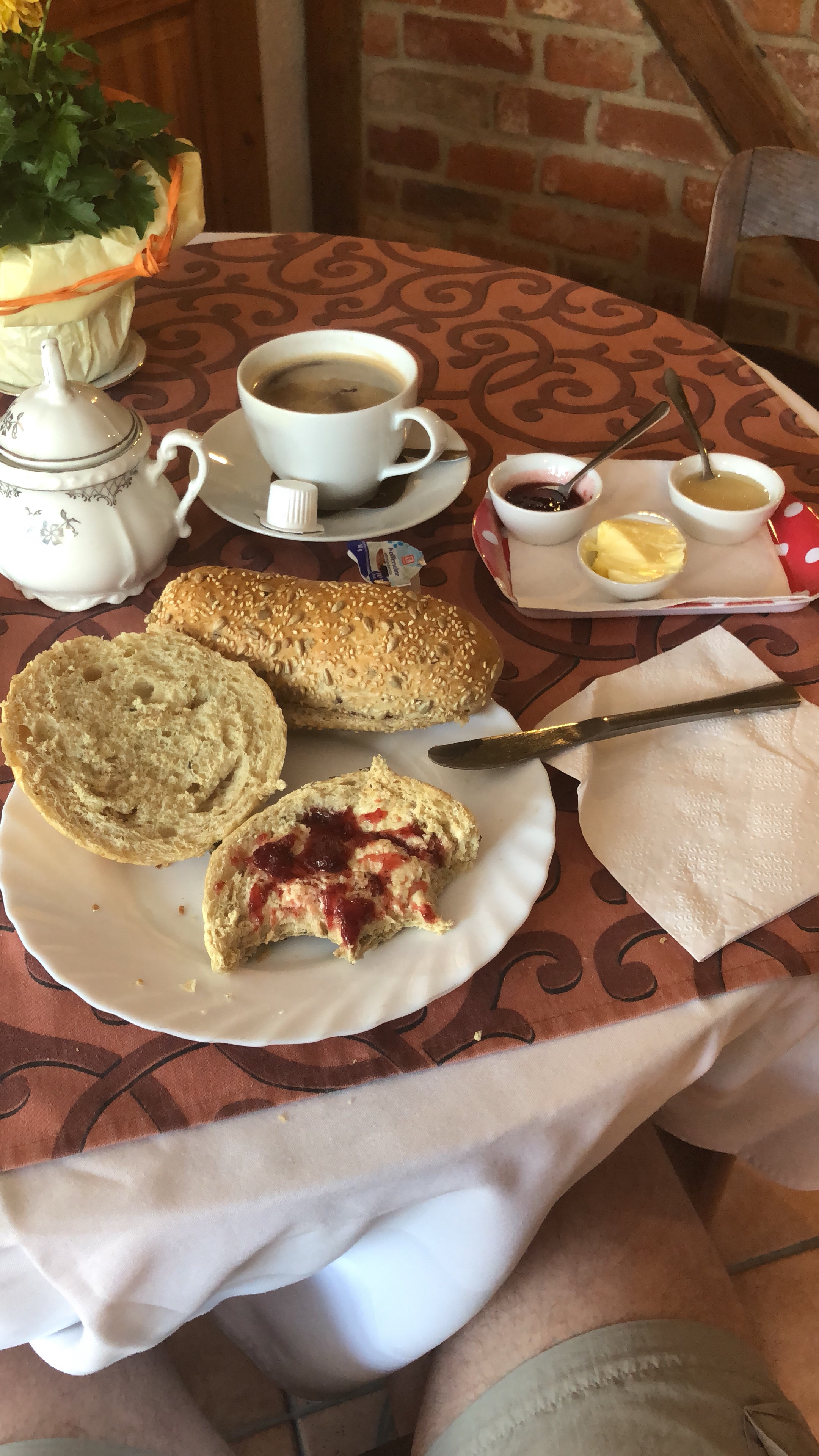 Die Nacht war gut, bin nur wieder mal zu früh wach geworden. Habe gepackt und bin in das Café nebenan gegangen und habe dort nach Frühstück gefragt. Die Dame hinter der Theke fragte, ob ich Pilger sei und nebenan geschlafen hätte. Als ich dem zustimmte, meinte sie, das Frühstück wäre für Pilger kostenlos! Nach zwei Brötchen mit Marmelade und einem Pott Kaffee bin ich dann losgezogen.