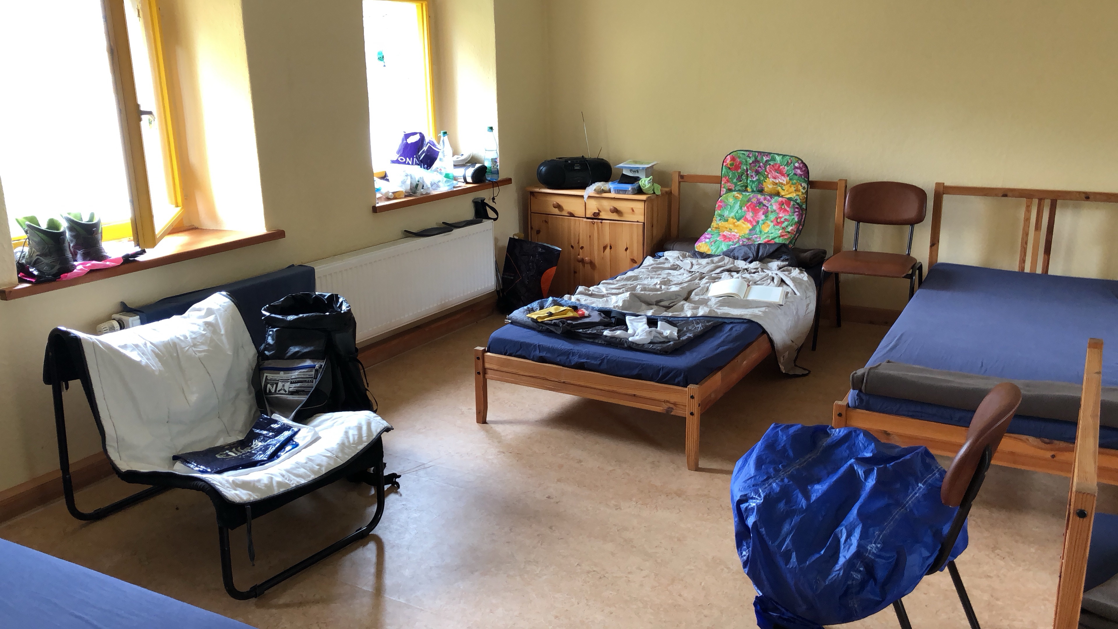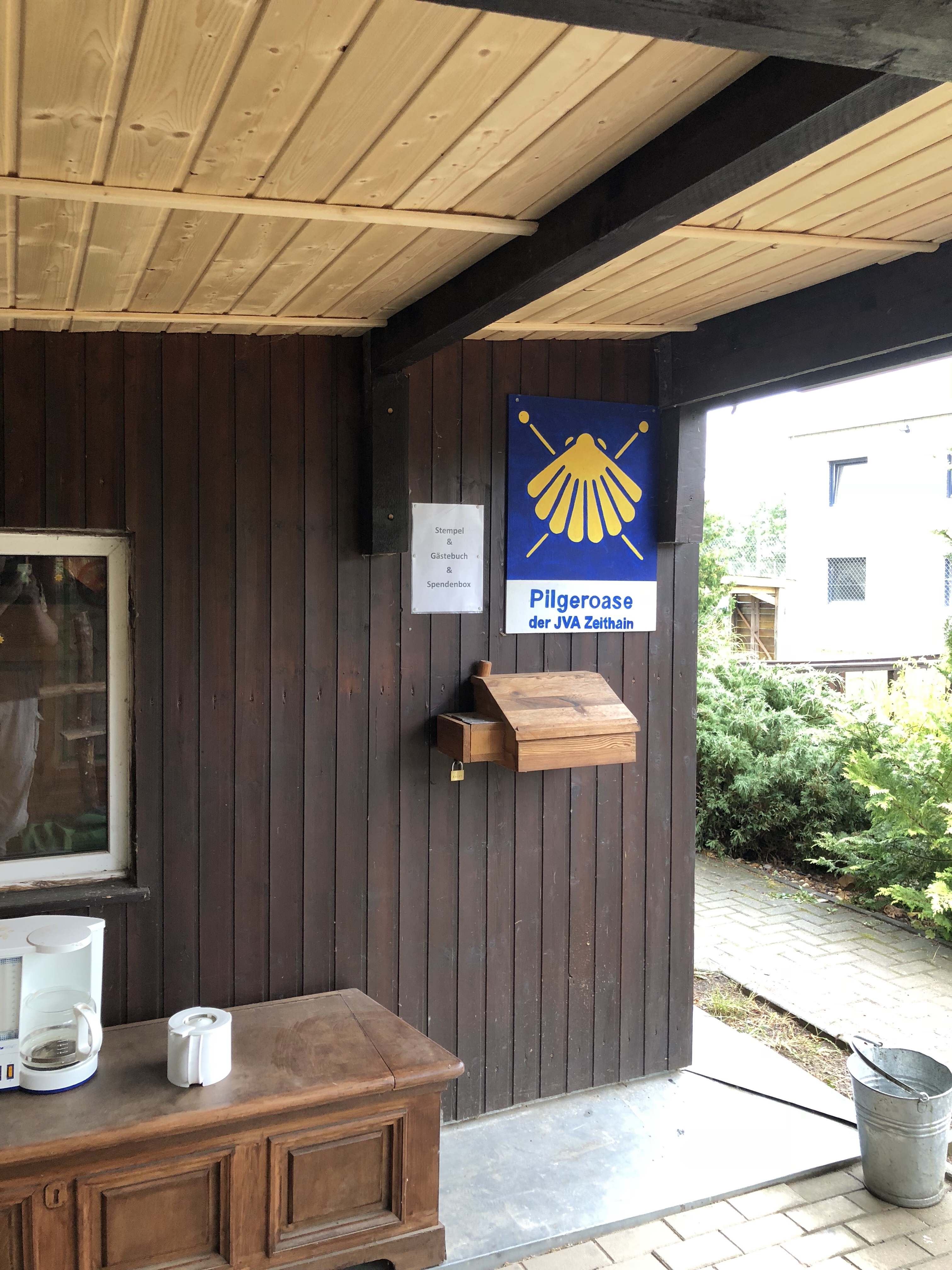 Dann ging es weiter nach Zeithain. In der dortigen Justizvollzugsanstalt gibt es eine Pilgeroase. Man geht zum Tor, meldet sich dort an und geht dann zum Gebäude des offenen Vollzugs. Dort hat mich dann ein Häftling in den Garten gebracht, wo eigentlich ein Austausch zwischen Pilgern und Häftlingen stattfinden sollte. Leider hatten die keine Zeit, weil es Mittagessen gab. Und bei dem Sauwetter war natürlich auch niemand draußen