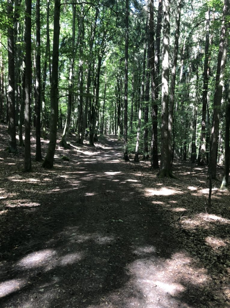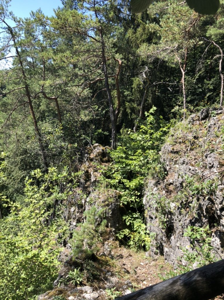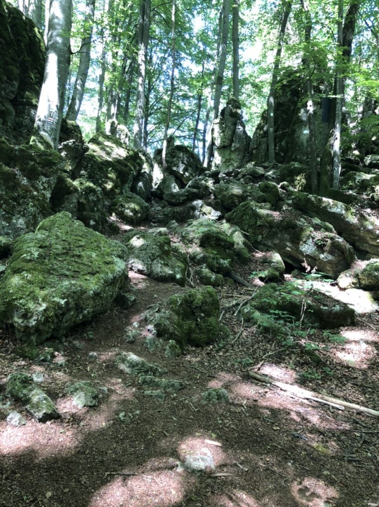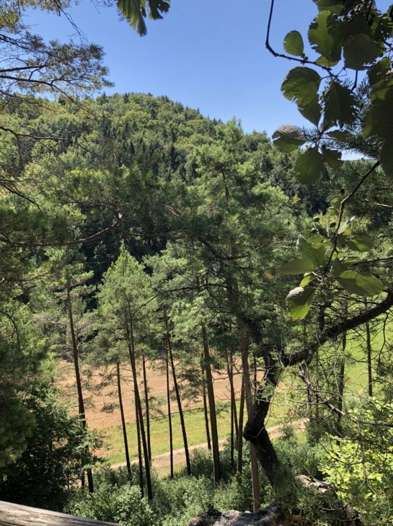 Im weiteren Verlauf des Weges haben wir eine Abzweigung verpasst, das aber relativ schnell bemerkt. Wir hätten dann über Felder den richtigen Weg wieder erreichen können, sind aber die Strecke wieder zurück gegangen und dann über den Tannberg. Das war mit Abstand die schlimmste Steigung, die wir in den 6 Tagen hatten! Aber oben angekommen war der Weg schön und führte uns langsam bergab wieder Richtung Autobahn. Diese haben wir diesmal überquert und konnten dann die weitere Strecke geniessen. Wie bisher sehr abwechslungsreich: Wälder, Wiesen, Felsen, Höhlen. Es war sehr warm, aber zum Glück ging der Weg meistens durch den Wald.