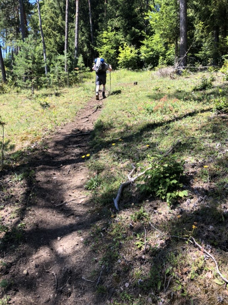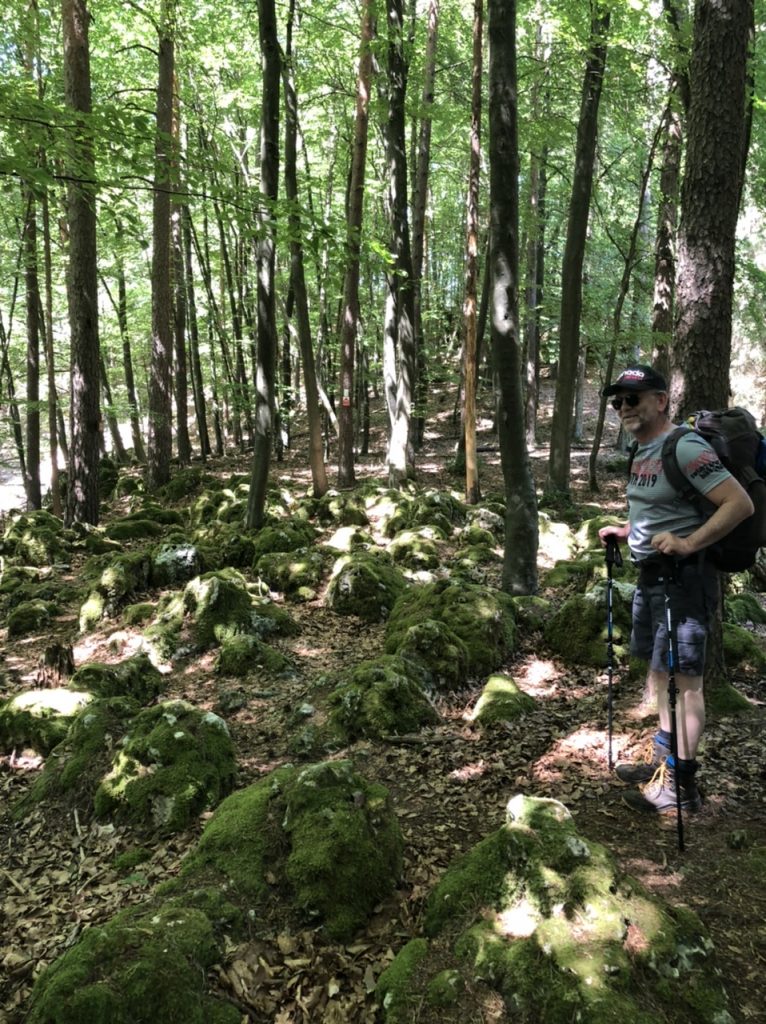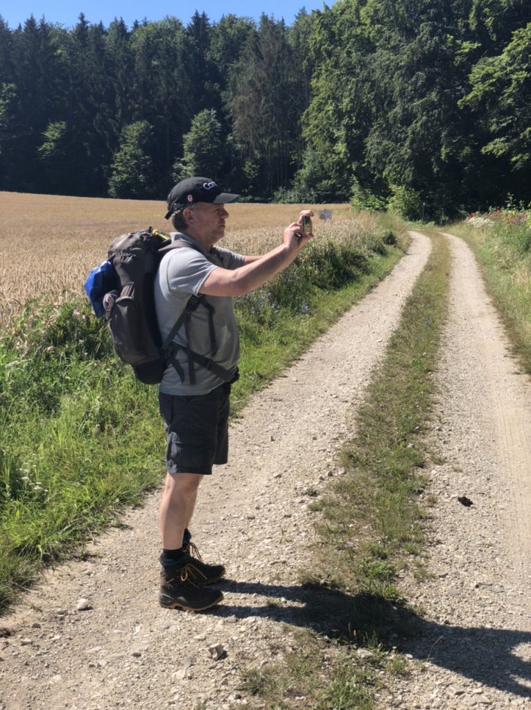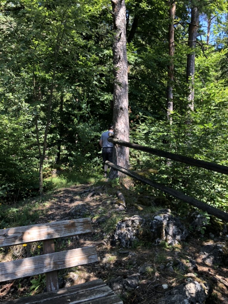 Im weiteren Verlauf des Weges haben wir eine Abzweigung verpasst, das aber relativ schnell bemerkt. Wir hätten dann über Felder den richtigen Weg wieder erreichen können, sind aber die Strecke wieder zurück gegangen und dann über den Tannberg. Das war mit Abstand die schlimmste Steigung, die wir in den 6 Tagen hatten! Aber oben angekommen war der Weg schön und führte uns langsam bergab wieder Richtung Autobahn. Diese haben wir diesmal überquert und konnten dann die weitere Strecke geniessen. Wie bisher sehr abwechslungsreich: Wälder, Wiesen, Felsen, Höhlen. Es war sehr warm, aber zum Glück ging der Weg meistens durch den Wald.